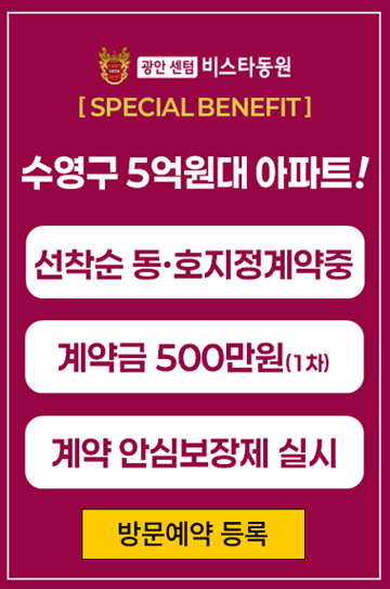 교통특권 더블역세권2·3호선 수영역(환승역), 도보 5분 내 3호선 망미역 TRAFFIC 자연특권 더블역세권단지 초근접 금련산 및 황령산 인접 청정환경 NATURE 교육특권 학세권반경 500m내 초중고 도보거리 집중 위치 EDUCATION 개발수혜 미니 신도시급1.9만세대 대규모 개발사업으로 앞선 미래가치 BENEFIT 생활인프라 의료,문화백화점, 대형마트, 수영팔도시장, 센텀종합병원 등 INFRA DW 비스타 동원부울경 No.1 브랜드 파워의 하이엔드 명품아파트 VISTA DONGWON 교통특권 더블역세권2·3호선 수영역(환승역), 도보 5분 내 3호선 망미역 TRAFFIC 자연특권 더블역세권단지 초근접 금련산 및 황령산 인접 청정환경 NATURE 교육특권 학세권반경 500m내 초중고 도보거리 집중 위치 EDUCATION 개발수혜 미니 신도시급1.9만세대 대규모 개발사업으로 앞선 미래가치 BENEFIT 생활인프라 의료,문화백화점, 대형마트, 수영팔도시장, 센텀종합병원 등 INFRA DW 비스타 동원부울경 No.1 브랜드 파워의 하이엔드 명품아파트 VISTA DONGWON
